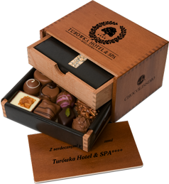 UMIESTŇUJEME LOGO rôznymi technikami na baleniach našich čokolád – gravírujeme na drevo, robíme potlače na plechovkách a kartónoch a taktiež umiestňujeme nálepky s vlastnou grafikou (viac v kategórii "Personalizované firemné darčeky").
