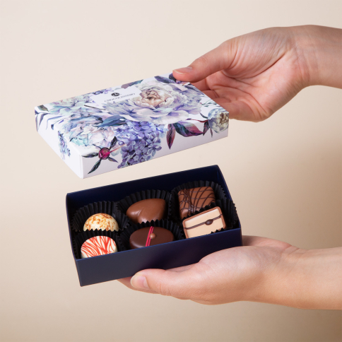 Nový produkt v nezvyčajne elegantnom vydaní - 6 výborných praliniek v krásnej krabičke s kvetinovým vzorom. Vnútri nájdete 6 ručne vyrobených praliniek, ktorých chuť nadchne aj náročného gurmána.