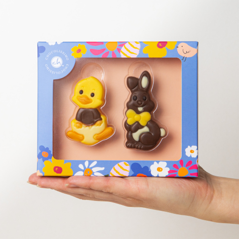 Dve roztomilé čokoládové figúrky vyrobené kombináciou bielej, mliečnej a horkej čokolády. Zaručene urobia radosť malým i veľkým milovníkom čokolády.