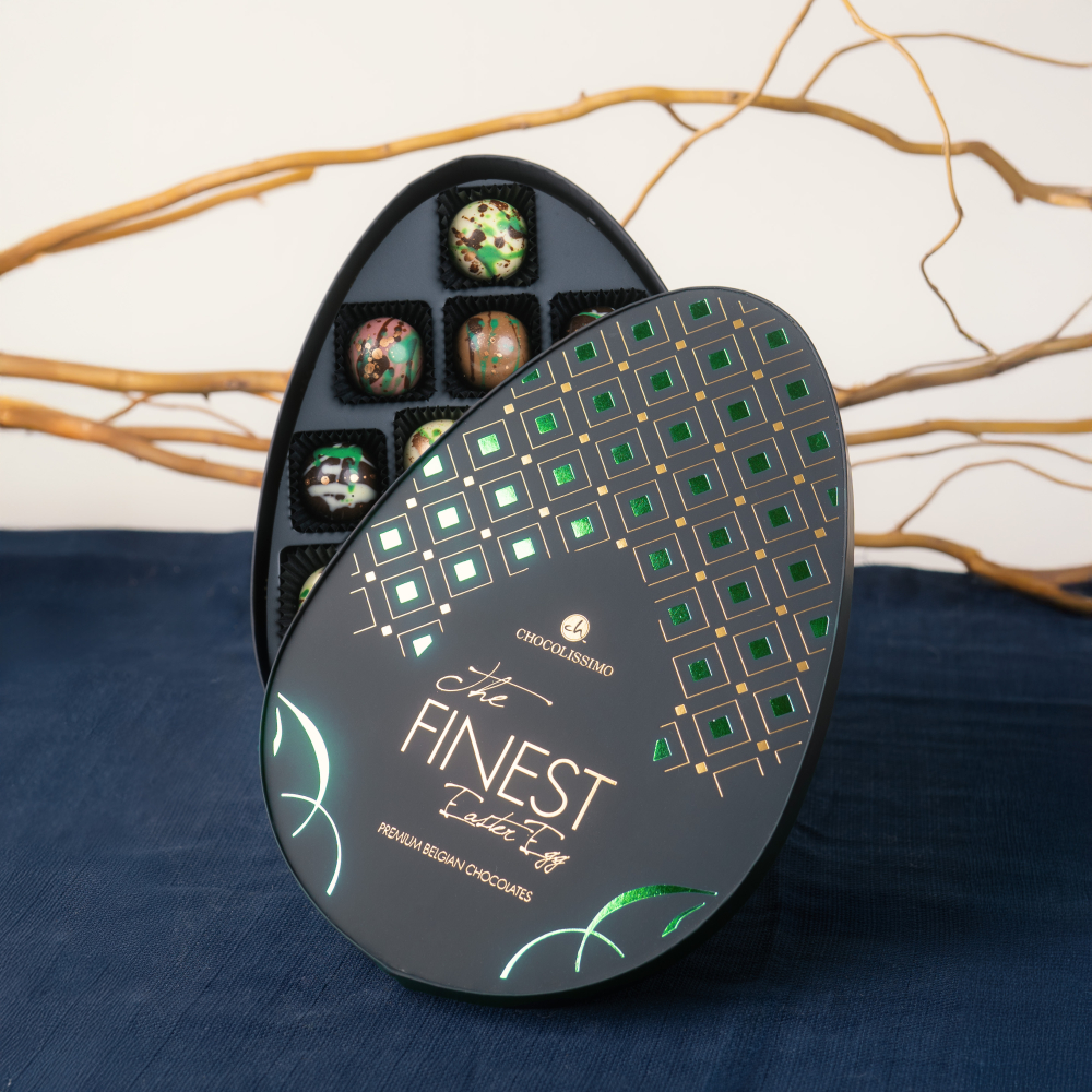 Sviatočné balenie v tvare veľkonočného vajíčka v zeleno-zlatom dizajne, ktoré je naplnené 19 ručne vyrobenými čokoládovými vajíčkami s náplňou. Každá pralinka je skutočným umeleckým dielom. The Finest Easter Egg - to je ponuka pre tých z vás, ktorí hľadáte exkluzívny veľkonočný darček.