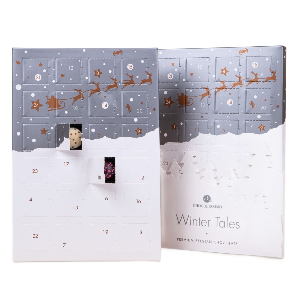 Tvarom plochý adventný kalendár čiastočne zahalený snehobielou zimnou krajinou obsahuje ručne vyrábané pralinky z tej najlepšej belgickej čokolády aby vám spríjemnili čakanie na Štedrý deň. Výnimočný adventný kalendár, ktorý v sebe skrýva 24 výborných drobných belgických praliniek v 3 druhoch.